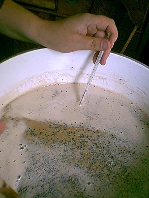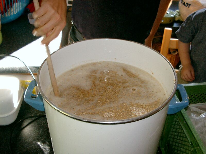 vorsichtig eingerührt. Diese Mischung (Maische) wird dann unter ständigem