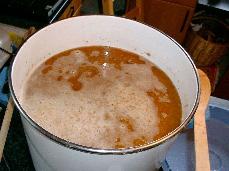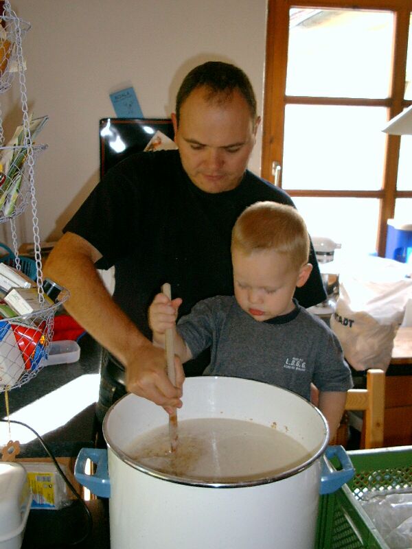 Alternativ dazu gibt es das sogenannte Dekoktionsverfahren, bei dem das Malz zunächst mit relativ heißem Wasser vermischt wird. Danach wird nach und nach eine bestimmte Menge fast kochendes Wasser zugesetzt, damit das Ganze die nächste Temperaturstufe erreicht. Wir haben eine Tabelle gebastelt, mit der man die Temperatur einer vorzugebenden Menge des zuzufügenden Wassers berechnen kann, die geneigten InteressentInnen können sie sich herunterladen . Man muß ein bißchen mit den Mengenangaben herumspielen, damit man geeignete Werte erhält.
